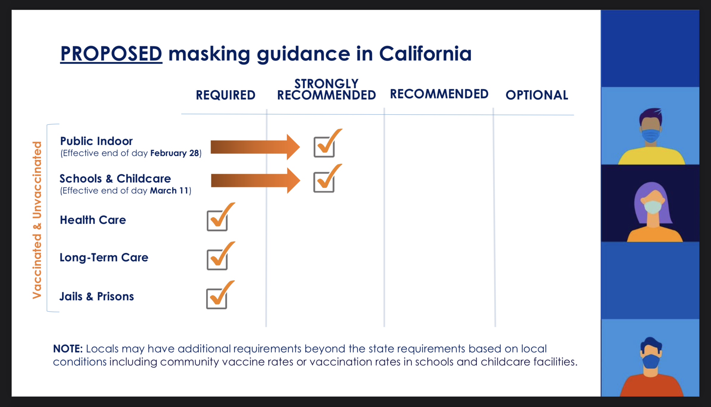 March 1, 2022 – Yesterday, the California Department of Public Health (CDPH) updated its statewide COVID-19 (Coronavirus) masking guidance to align with recent data trends which show dramatic decreases in the level of COVID-19 virus and virus transmission throughout the state. The two main updates impact general indoor public spaces, and K-12 schools and childcare.
