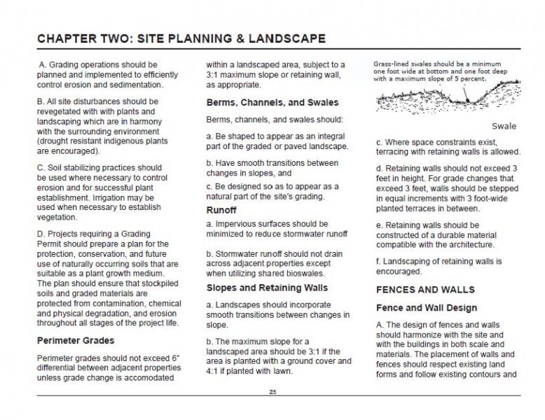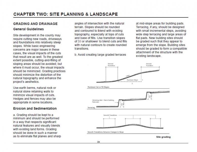 - Site design should not change natural drainage patterns. Site grading should be sensitive to existing landforms and topography so that the natural setting may be preserved to the greatest extent possible. When modifications are necessary, surface drainage with retention facilities is preferred to underground systems