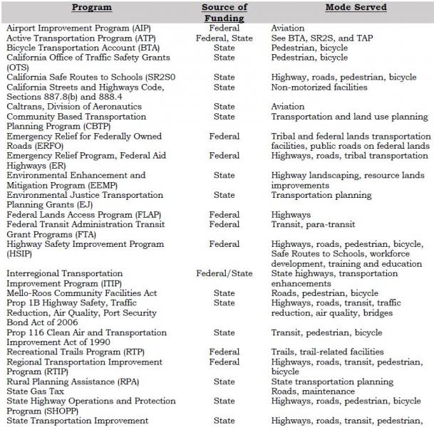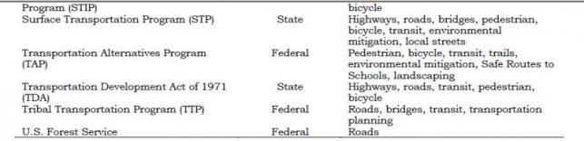 Funding for bikeways and associated facilities is available from a number of federal and state programs. This section summarizes each of those sources. Generally, the local jurisdiction is responsible for applying for the funding identified below. Cooperative efforts among local agencies, such as the Forest Service, the County, and other local entities have been successful in obtaining funding for Mono County projects. It is important to note that many of these programs provide funding for the construction of bicycle facilities but not for on-going maintenance.