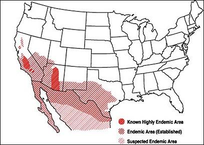 The five affected states that report cases—Arizona, California, Nevada, New Mexico, and Utah—recorded just 2,265 in 1998, or 5.3 per 100,000 population. By 2011 the number reached 22,401 cases, or 42.6 per 100,000.