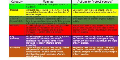 People with heart or lung disease (including asthma), the elderly, children, and pregnant women should AVOID prolonged or heavy exertion. The general public should limit prolonged or heavy exertion as much as possible.